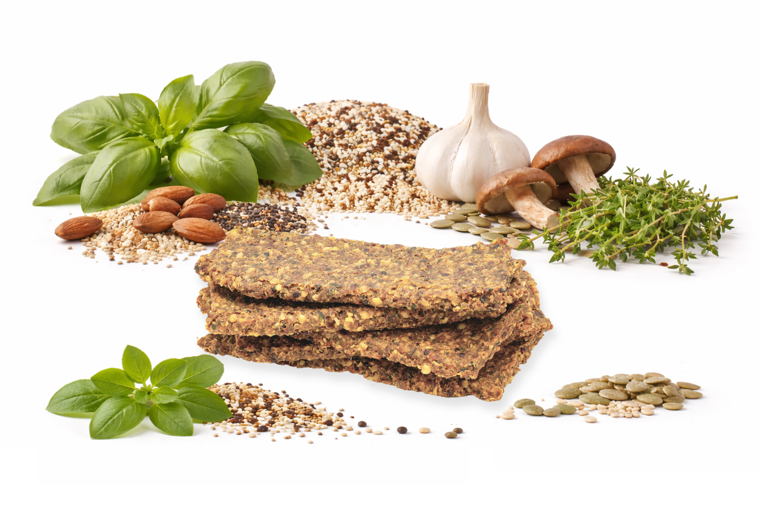 A kakukkfű és a bazsalikom párosa a mediterrán konyha egyik klasszikus fűszerkombinációja. Friss, zöldfűszeres karakterük különleges ízvilágot ad a szeleteknek, amely jól illeszkedik a magvak és növényi összetevők természetes aromáihoz.