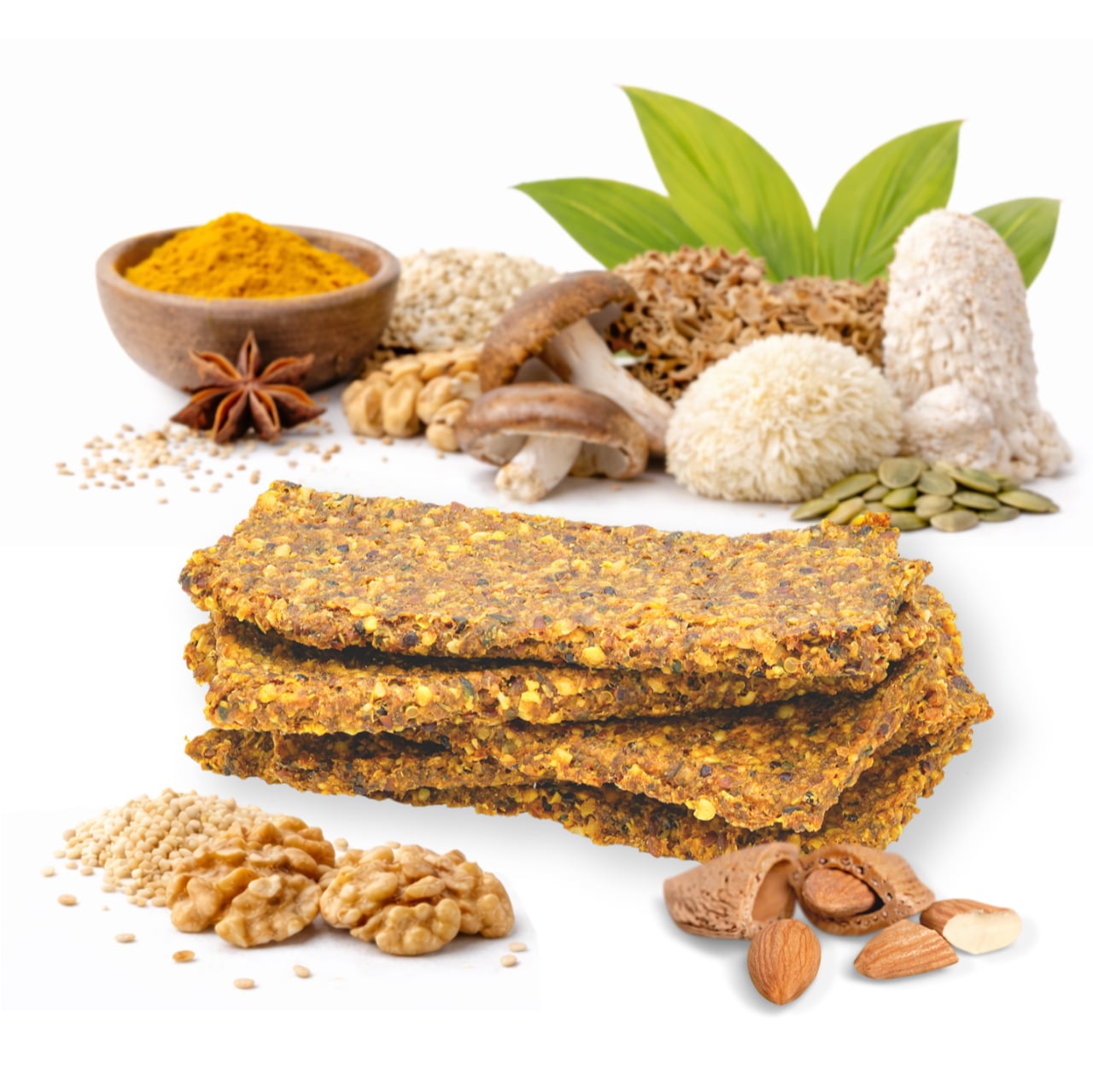 A quinoa, valamint a különböző olajos magvak és diófélék rétegzett textúrát és gazdag ízélményt biztosítanak, miközben természetes forrásai a telítetlen zsírsavaknak. A kurkuma, a pirospaprika, a kömény és az egyéb keleties fűszerek összehangolt jelenléte határozott, fűszeres karaktert ad a szeleteknek. A receptúrát növényi rostok és β-glükán-tartalmú gombakivonatok egészítik ki, amelyek jól illeszkednek a változatos, rostban gazdag étrend szemléletéhez.